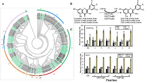 A.百脈根和擬南芥所有UGT蛋白的進化關(guān)系分析。B. 三個UGT重組蛋白以不同黃酮醇為底物的催化反應(yīng)示意圖。C. 過量表達UGT基因的擬南芥幼苗(上圖)和種子中(下圖)黃酮醇的含量分析